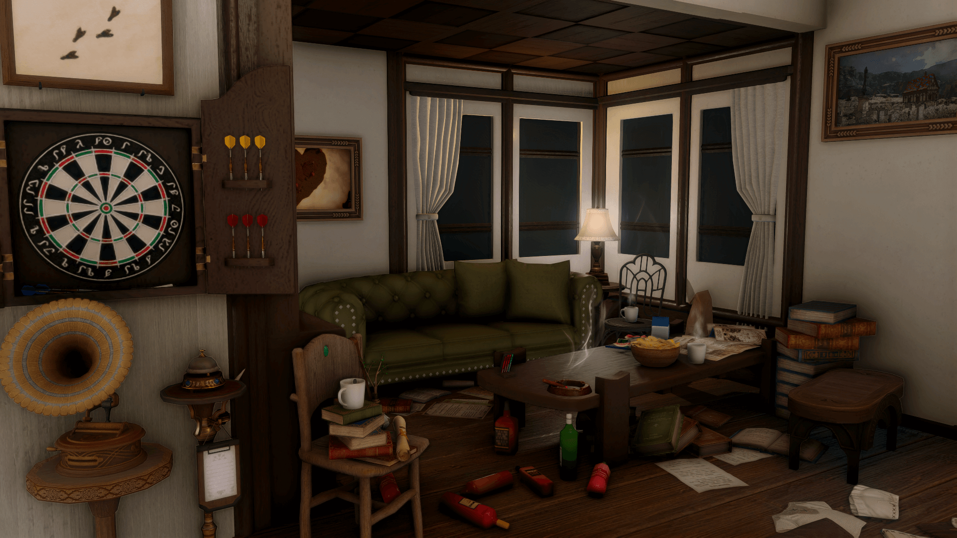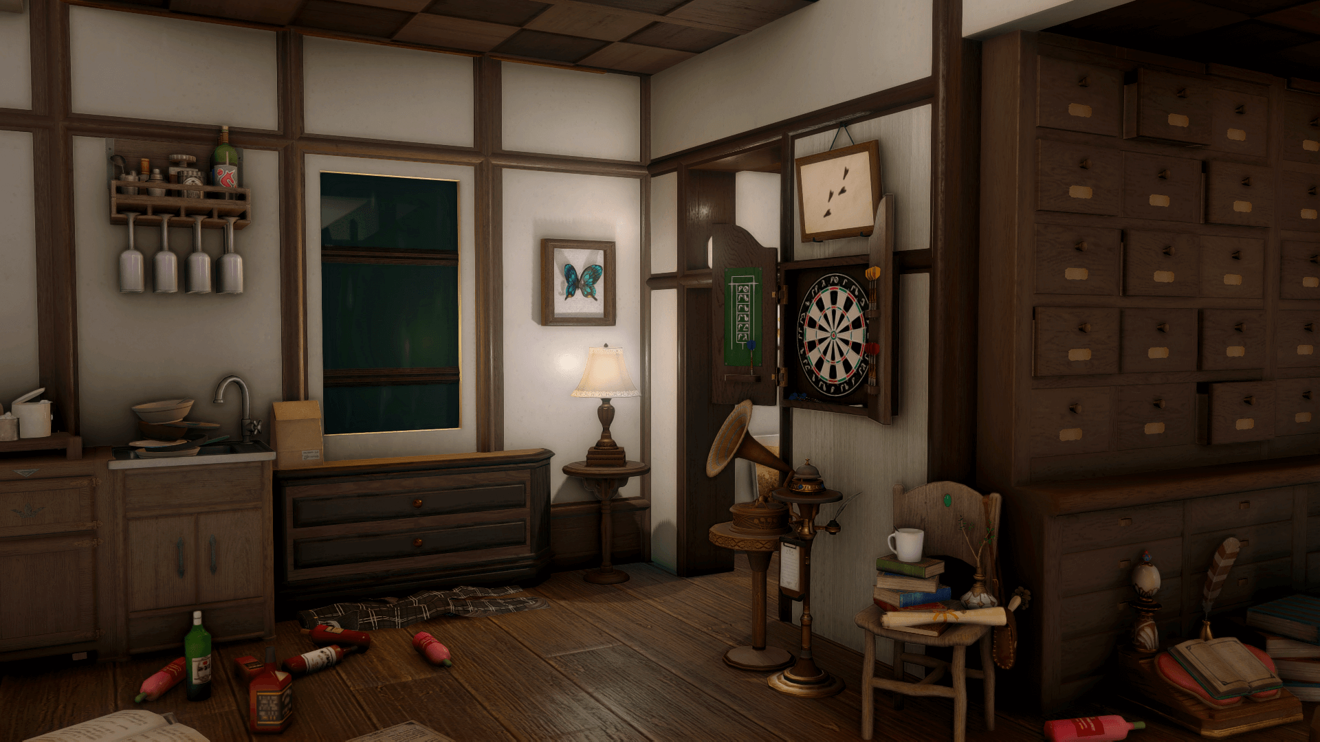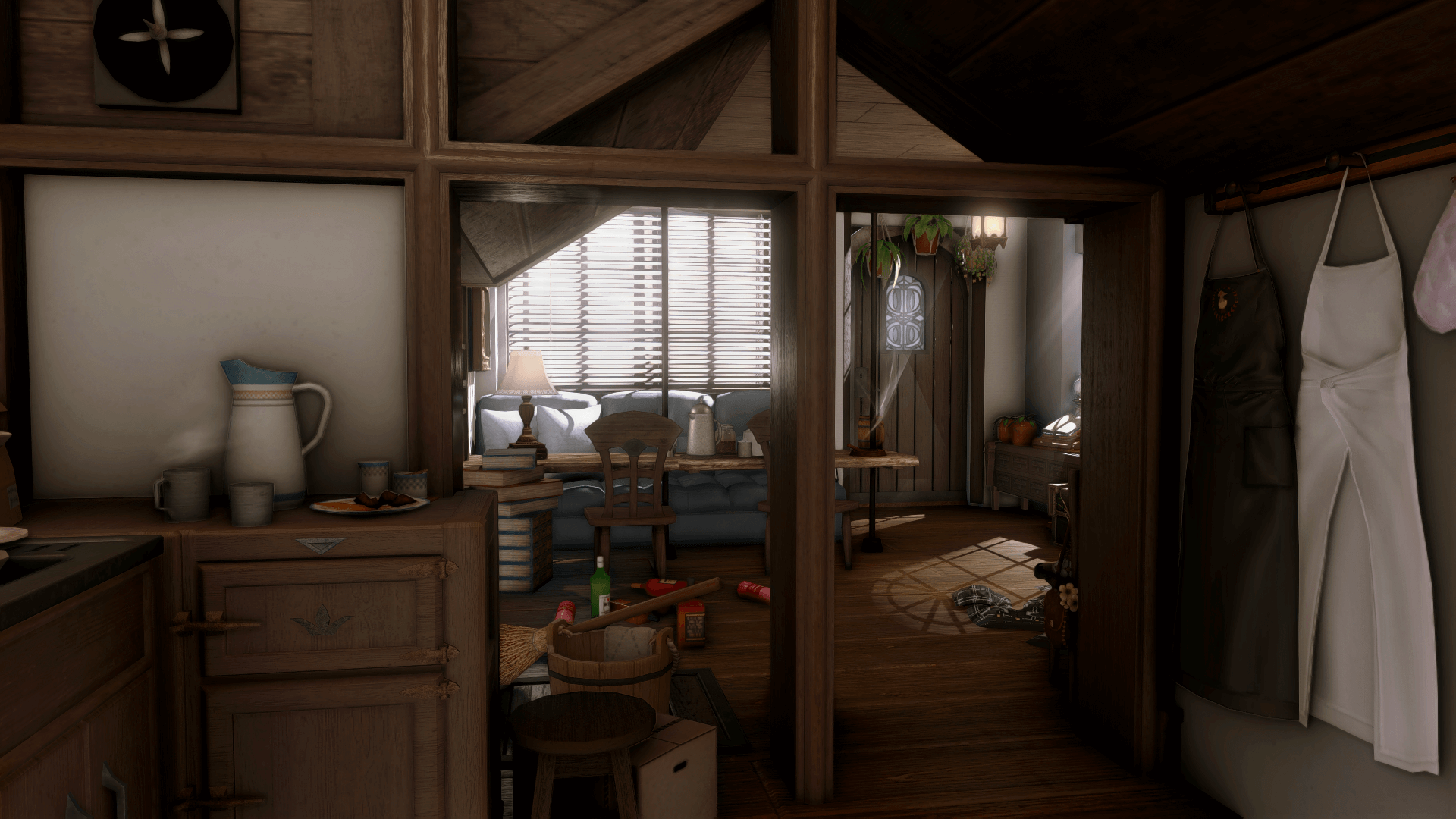 this is my personal house. i finished this build just after dawntrail released because i was so in love with the newly added rail-and-stile partition (which form the wall trim and open door 'frame' into the kitchen). the build changes slightly from day to nighttime; during the night the light fades from the windows to reveal rain falling (from waterfall partitions clipped into the wall). clothes are scattered on the floor, dirty dishes piled in the sink, and the house is otherwise messy and lived-in.