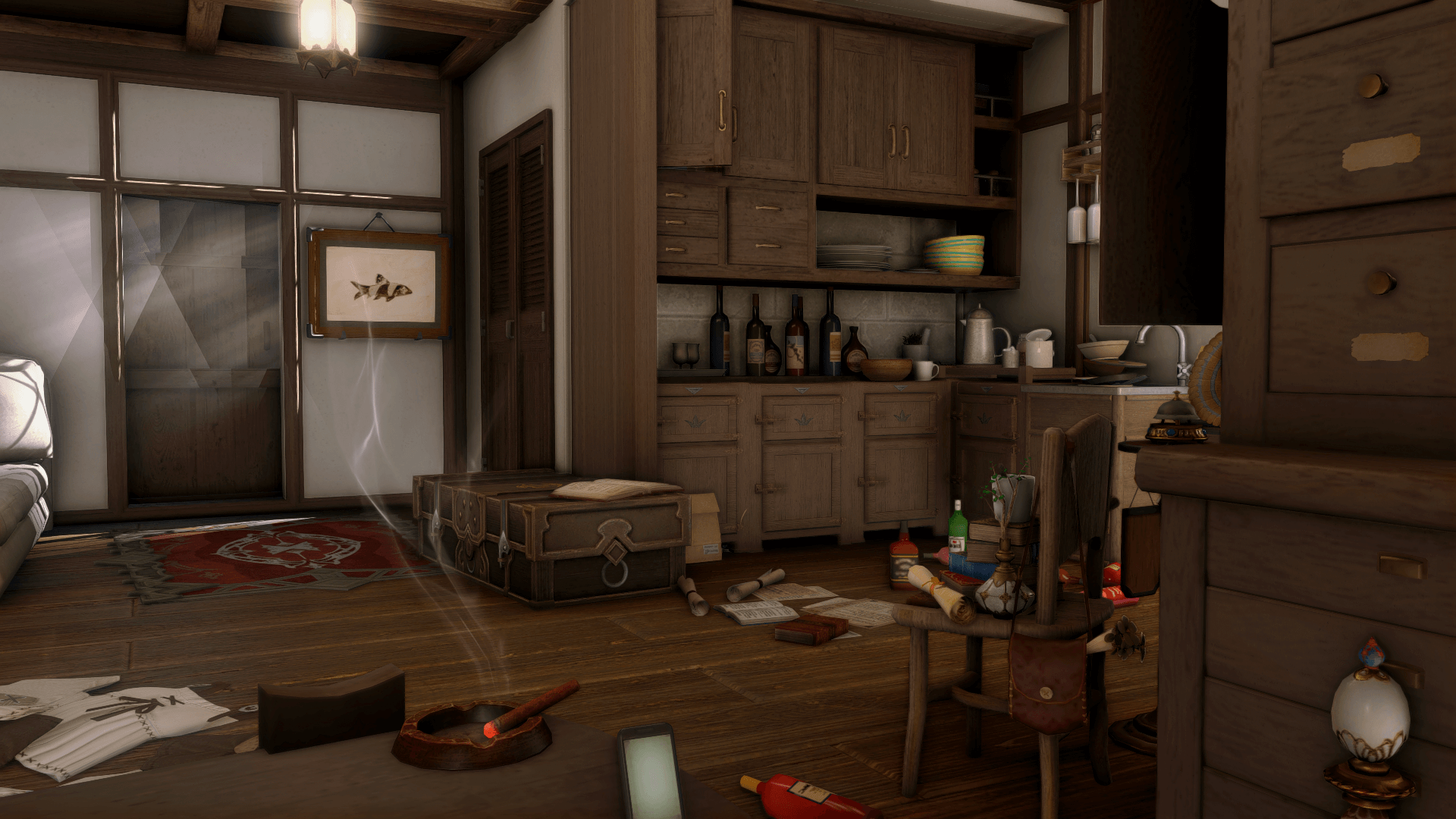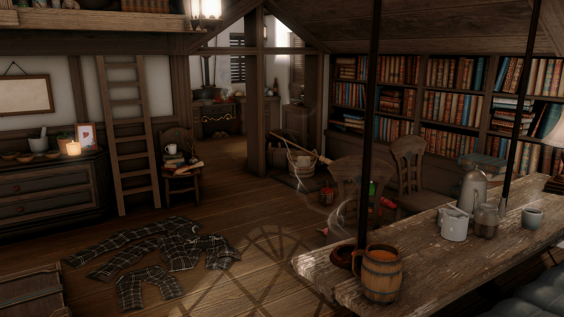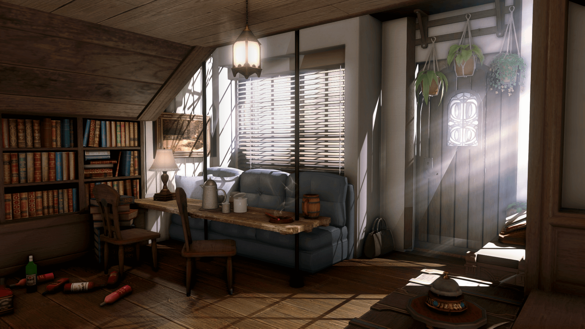 this is my personal house. i finished this build just after dawntrail released because i was so in love with the newly added rail-and-stile partition (which form the wall trim and open door 'frame' into the kitchen). the build changes slightly from day to nighttime; during the night the light fades from the windows to reveal rain falling (from waterfall partitions clipped into the wall). clothes are scattered on the floor, dirty dishes piled in the sink, and the house is otherwise messy and lived-in.